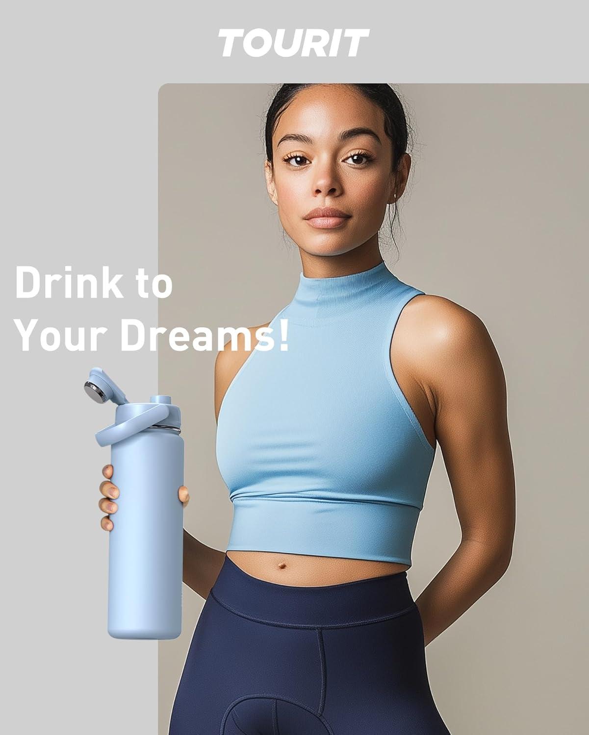 Insulated Sports Water Bottles: Tourit's 24 oz water bottle features advanced vacuum insulation technology, crafted with premium materials that ensure 12 hours of heat retention and 24 hours of cold preservation. It is ideal for enjoying hot beverages during winter camping or icy cold drinks post-workout.