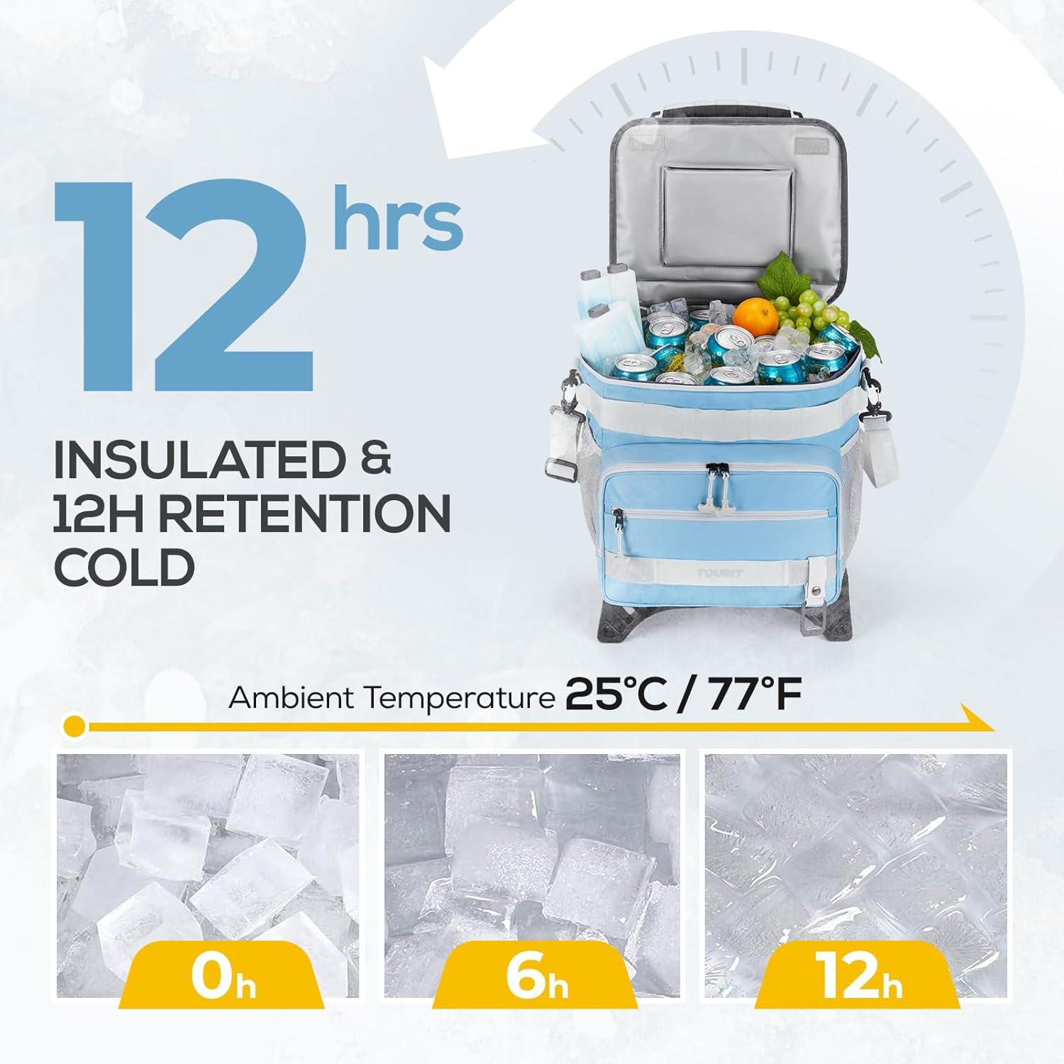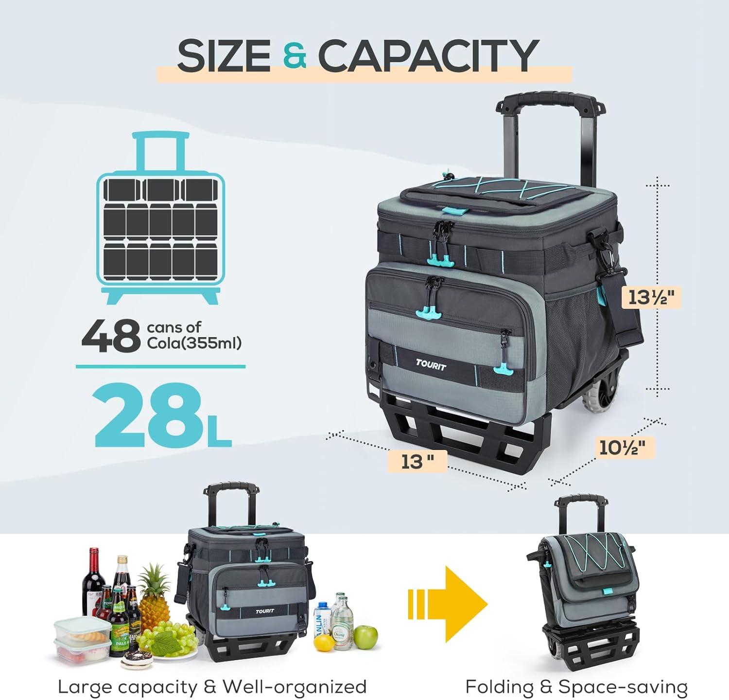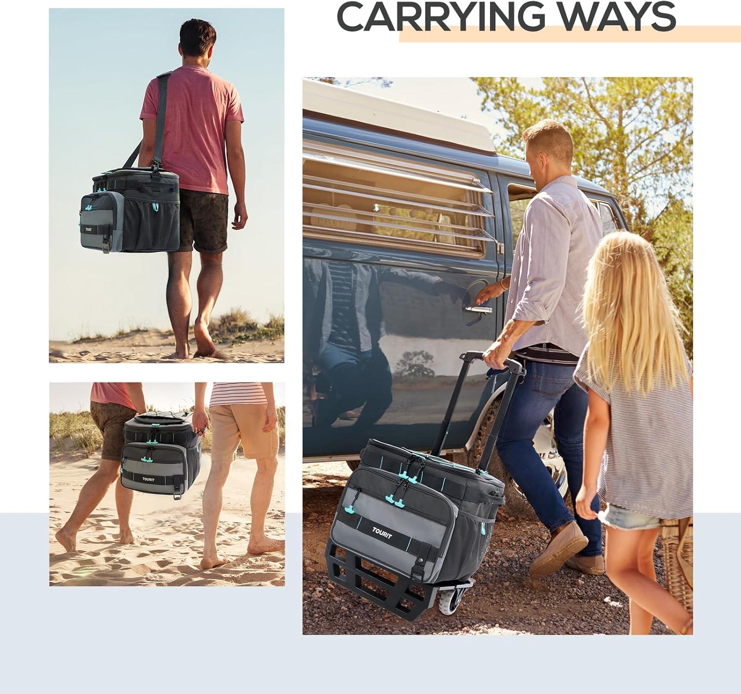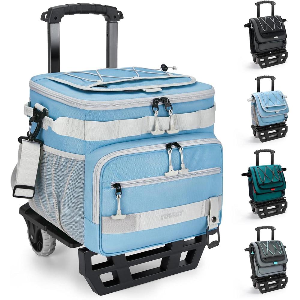 TOURIT Wheeled Cooler: Wheeled cooler features an insulated front compartment and an easy-access lid for quick access to food and beverages; Keeps ice for up to three days and holds up to 48 cans