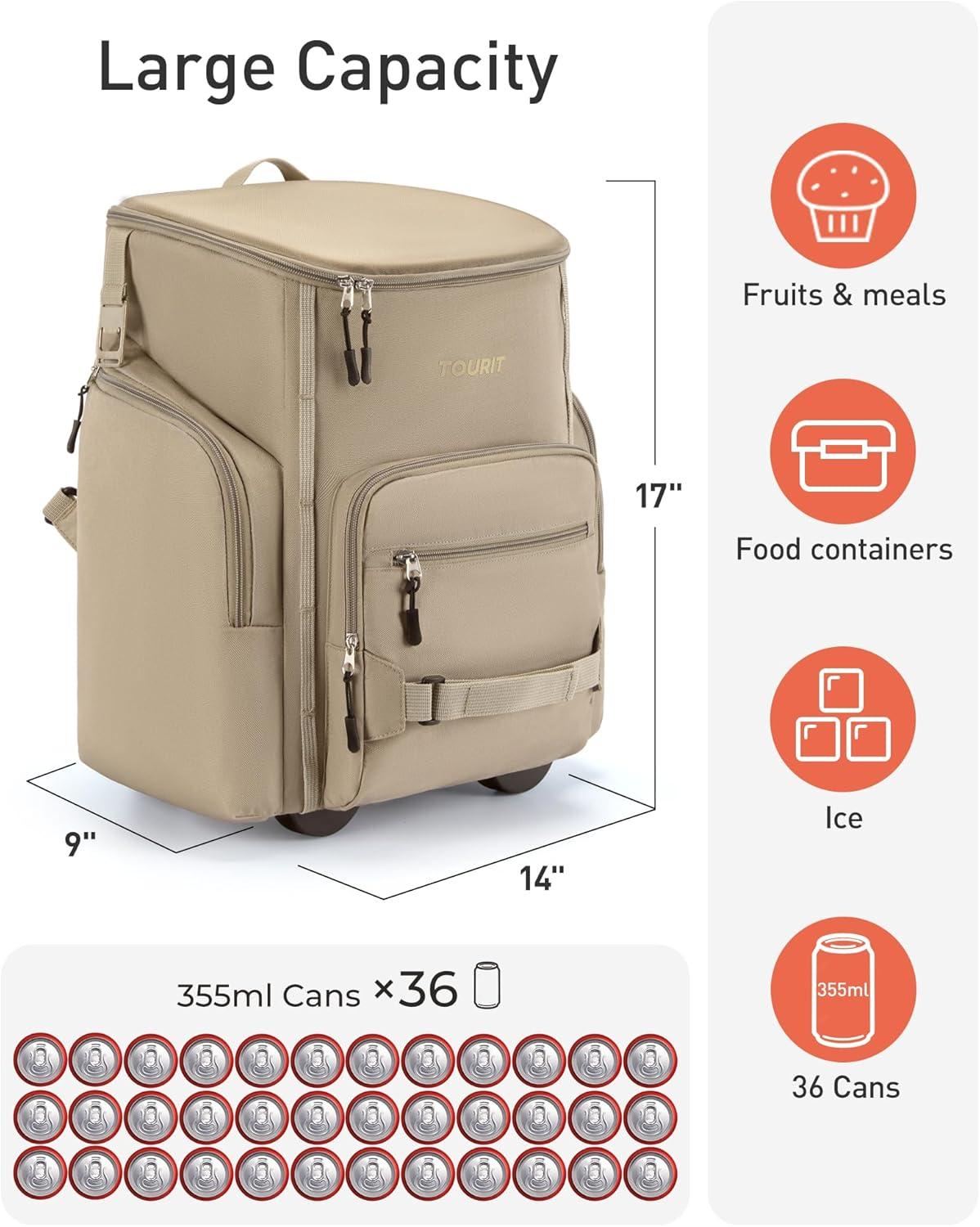 TOURIT Rolling Cooler Backpack: Leakproof Waterproof Insulated 36 Cans Beach Cooler with Wheels and Handle Outdoor Camping Picnic Travel(Black)